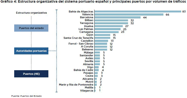 El sistema portuario español está integrado por 46 puertos que están gestionados por 28 Autoridades Portuarias, cuya coordinación y control de eficiencia corresponde al Organismo Público Puertos del Estado.