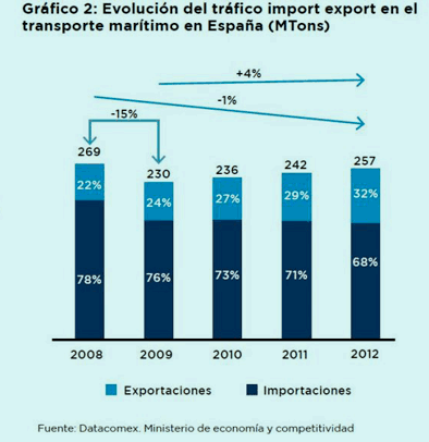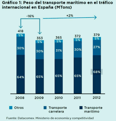 El transporte marítimo internacional en España cayó un 15% en 2009 y aún no ha recuperado los valores que presentaba antes de la crisis. Desde entonces, ha crecido a un 4% gracias a la creciente internacionalización de las empresas españolas que ha aumentado el peso de las exportaciones, pasando de representar el 24% en 2009 al 32% en 2012 del transporte marítimo internacional en España.