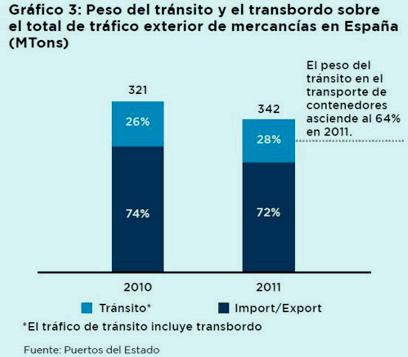 Este tráfico, que representa el 28% del total del tráfico global y entre el 55% y el 64% en contenedores en España, tiene unos costes de cambio de puerto prácticamente nulos, lo que lo convierte en un tráfico muy volátil y es por ello que son claves la eficiencia y la calidad del servicio, valorando no sólo el coste del servicio sino el coste y el tiempo asociado a la estancia del barco en el puerto.